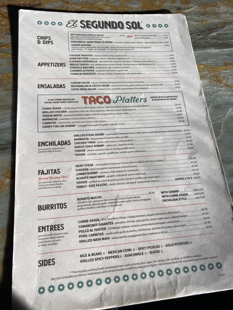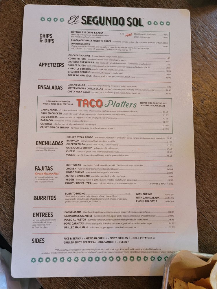 El Segundo Sol in Las Vegas offers a vibrant dining experience with a diverse menu catering to various dietary preferences. From bottomless chips & salsa to loaded nachos and flavorful tuna poke tacos, the appetizers are a treat for the taste buds. The salads, like the Watermelon & Cotija and Costa Mesa, offer a refreshing twist to traditional options. Customer reviews rave about the friendly service and delicious dishes, particularly highlighting the carne asada tacos and barbacoa burrito. The restaurant's spacious and well-decorated ambiance, along with reasonable prices, make it a go-to spot for Mexican cuisine in Vegas. Whether you're craving homemade guacamole or looking to try new flavors like chipotle BBQ ribs, El Segundo Sol exceeds expectations with its delectable offerings. With options for vegan and vegetarian diners, this restaurant truly caters to all tastes.